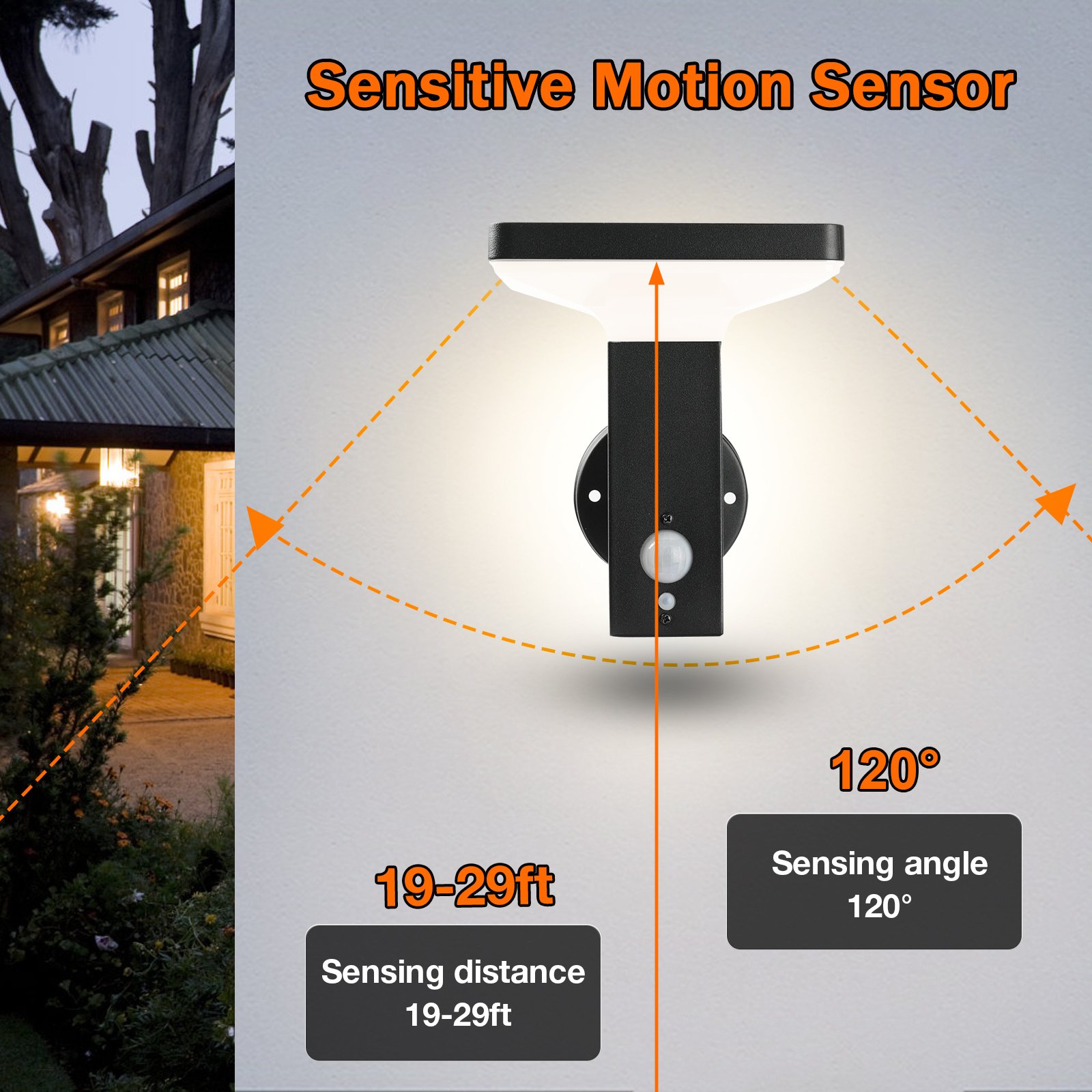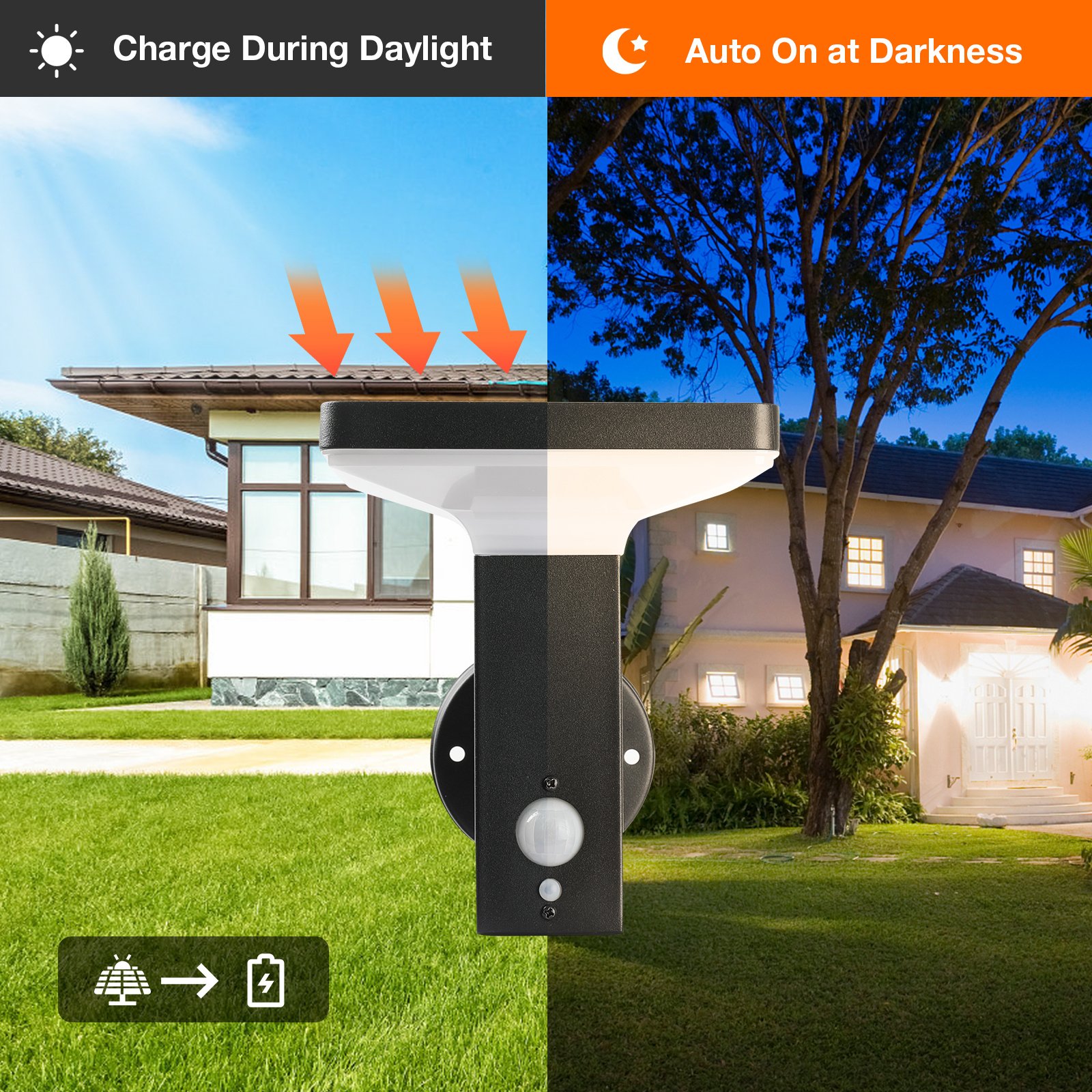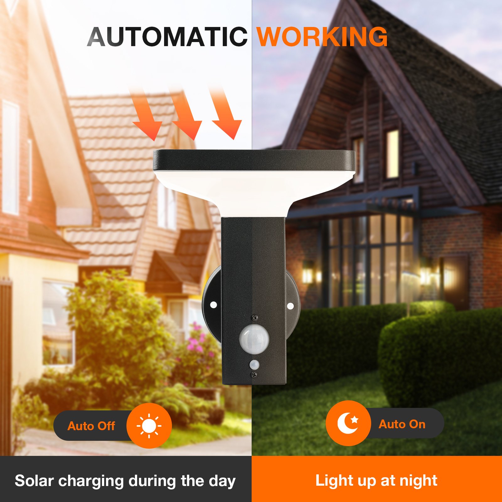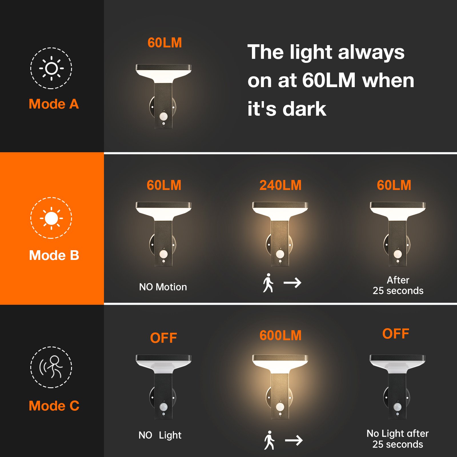 2.Dusk to dawn motion sensor: solar lights outdoor works auto at night. Solar wall lantern with 3 mode. a. Sensor turns on when detects move. b.Glow all night in low lumens. c. Light glow all night and become brighter when detects move.