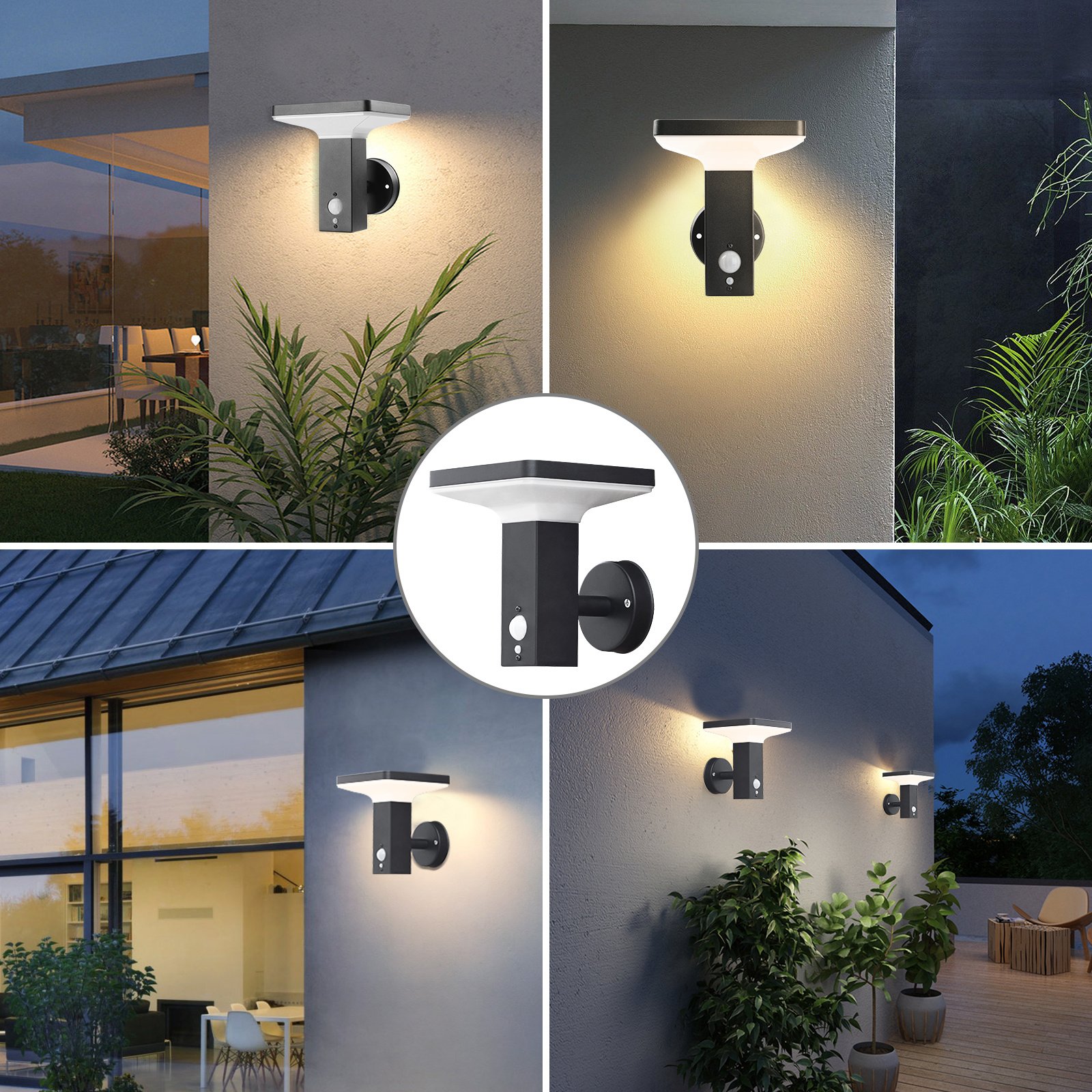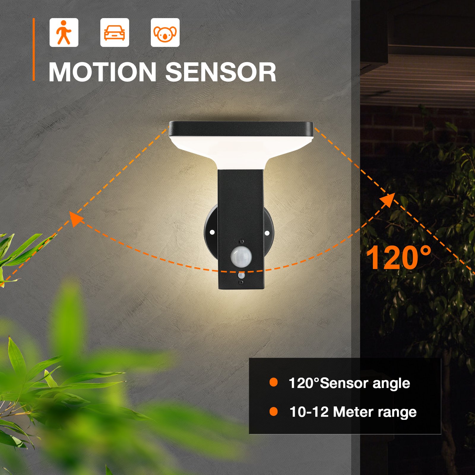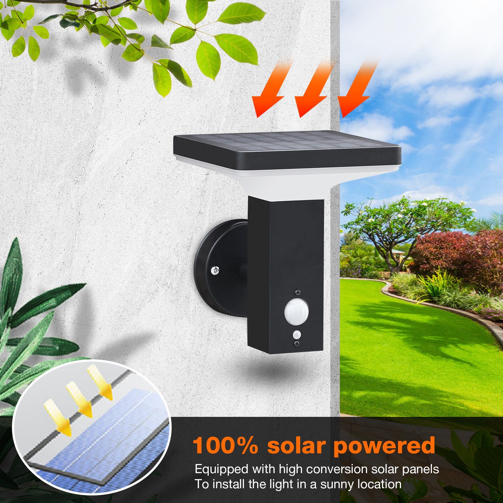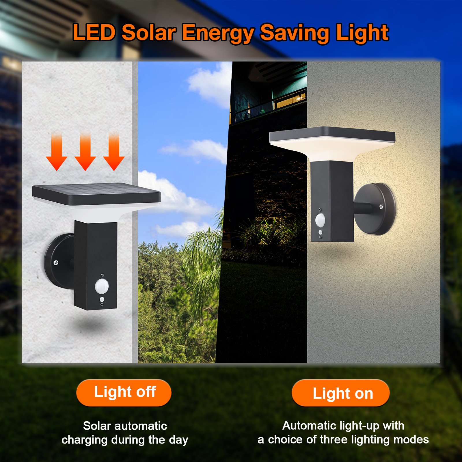 2.Dusk to dawn motion sensor: solar lights outdoor works auto at night. Solar wall lantern with 3 mode. a. Sensor turns on when detects move. b.Glow all night in low lumens. c. Light glow all night and become brighter when detects move.