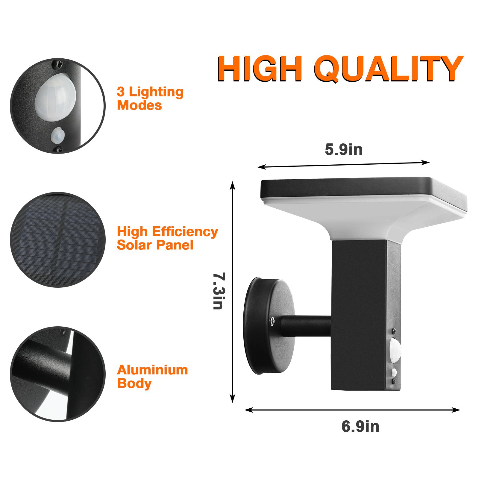 4.Lamp detail: solar powered outdoor lights size is 5.9*6.9*7.3in. Solar outdoor wall lights power is 4.4w, 3000k, max 600lm. Solar wall sconce design from Europe which have won the Red Dot, German Design, IF Design Award.